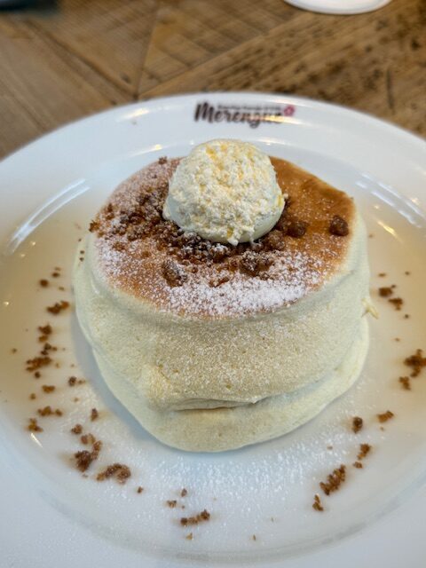 こちらの朝食プレートについてくるパンケーキはメレンゲふわふわでなく、